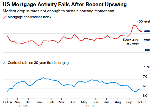 美国购房贷款申请以及房屋再融资贷款申请均连续第二周出现下降,这标志着此前被视为美国房地产市场复苏迹象的这一积极信号已迅速逆转。美国抵押贷款银行家协会(MBA)的房屋购买申请指数在截至10月3日的一周内下降了1.2%,而再融资指数则下降了7.7%。这两项指标均回落至9月初的水平,当时抵押贷款利率正朝着一年来的最低点迈进。综合这两项指标得出的数值在上周暴跌12.7%后,本周又下跌了4.7%,这是自4月以来连续两日跌幅最大的一次。