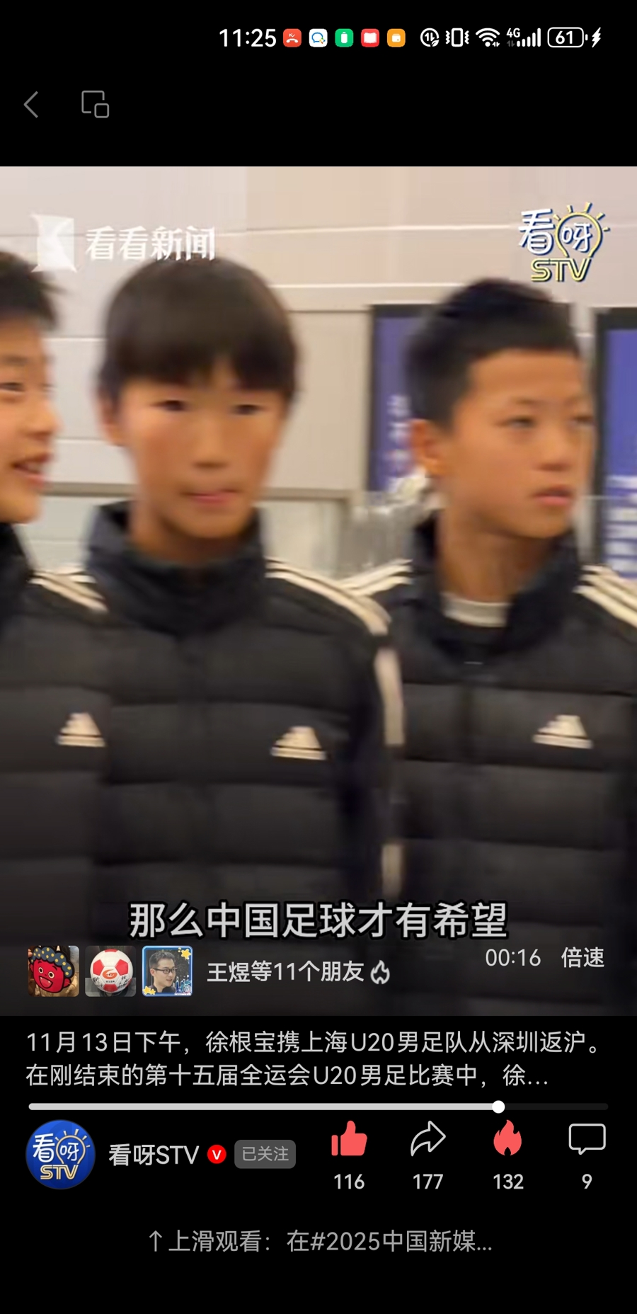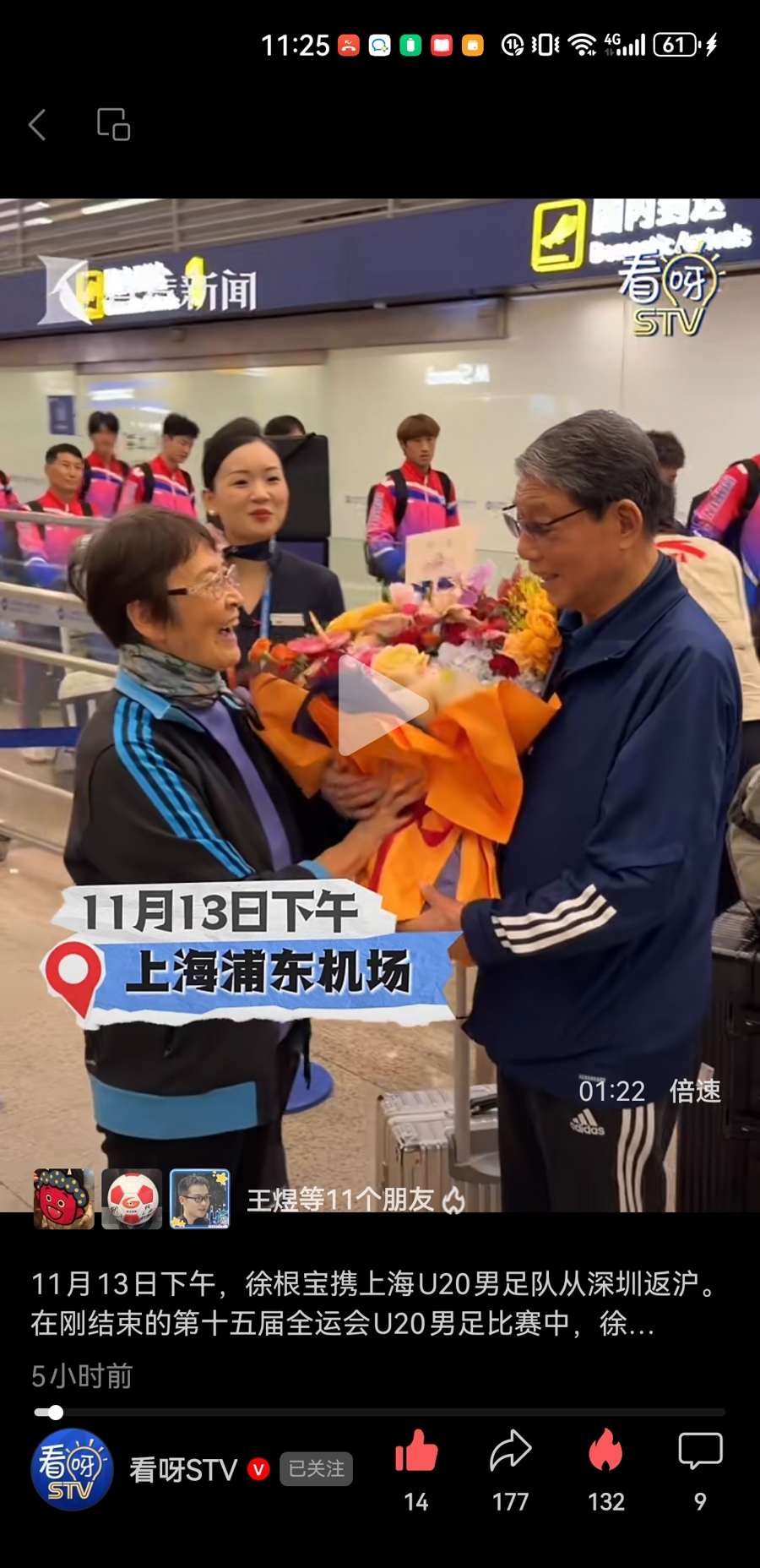 11月13日,由徐根宝挂帅的上海U20男足返回上海,他们在十五运男足U20组别摘下铜牌,这也是上海三支男足青训队伍的最佳战绩。在机场,来自根宝基地的两支“娃娃军”列队迎接,82岁的老帅开玩笑回应外界“退休传闻”:“我当了快50年足球教练,算上球员生涯,这一生就和足球结缘了。基地现在有1314梯队,我也就一生一世搞足球了。”